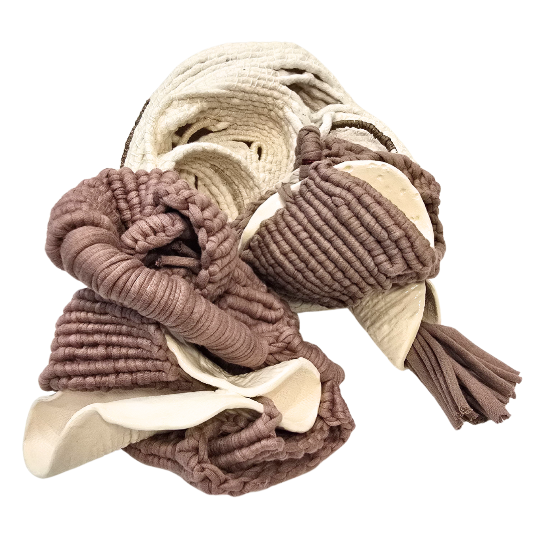 Hoy combino macramé, cestería y cerámica, entrelazando lo maleable con lo permanente, lo frágil con lo resistente. Rompo patrones y paradigmas para transformar cada objeto en una pieza que guarda memoria, herencia y vínculo.
