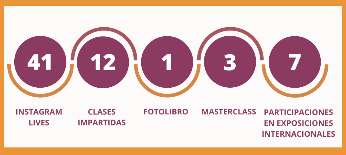 En medio de la incertidumbre de la pandemia, decidimos activarnos y hasta la fecha hemos realizado 41 IG Live, 15 clases impartidas y actividades formativas (virtuales y presenciales), publicamos 1 fotolibro (“Callar duele más”), 7 participaciones en exposiciones internacionales y, lo más importante, se ha conformado una comunidad de encuentro y reflexión en la que podemos compartir y crecer juntos. Gracias por ser parte de este grupo de soñadores despiertos que construyen y dan lo mejor.